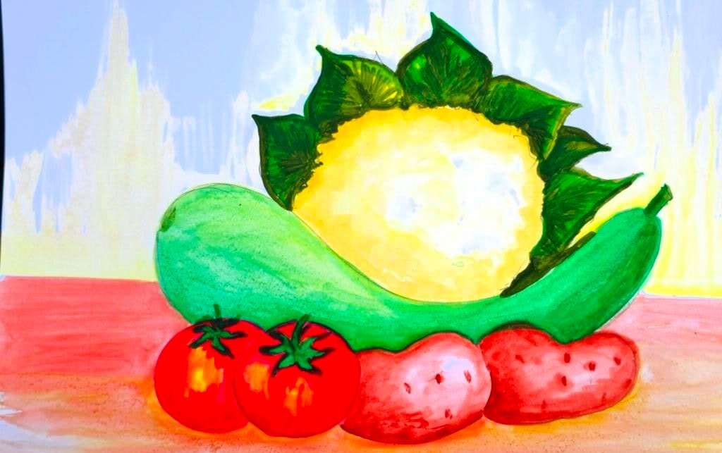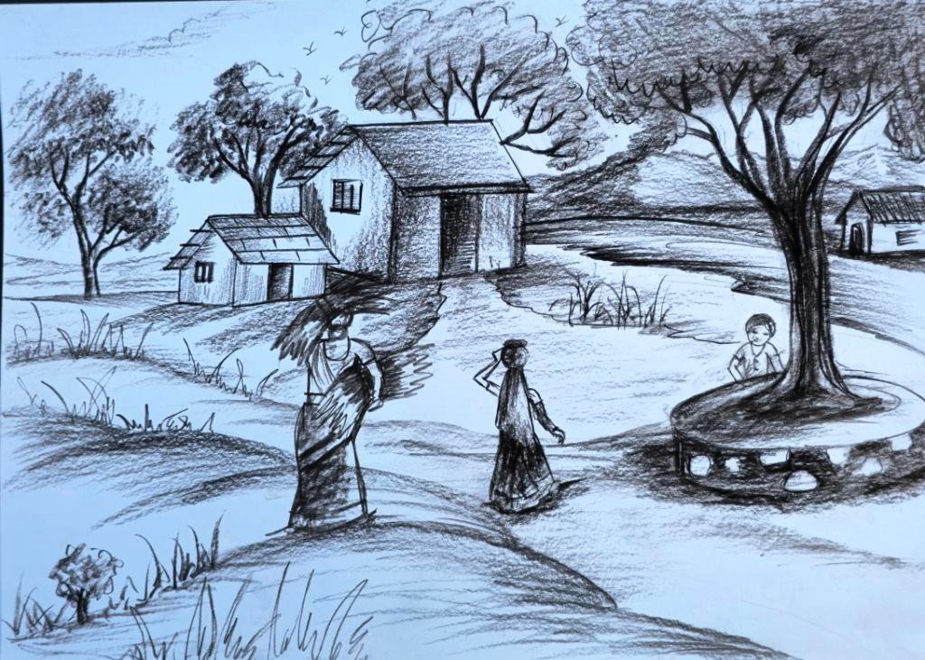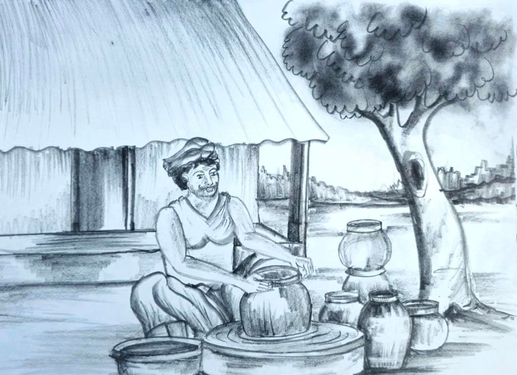 This pencil drawing depicts a serene scene of a potter at work outdoors. The potter, dressed in a simple dhoti, is seated on the ground, skillfully shaping a pot on a traditional wheel. Various pots in different stages of completion are placed nearby, showcasing the craft of pottery. The setting is rustic, with a thatched roof structure behind the potter and a tree to the right, adding to the tranquil rural ambiance. The drawing captures the essence of traditional Indian pottery, highlighting the artisan’s connection with nature and craft. The use of pencil shading gives the image a soft, contemplative feel, emphasizing the simplicity and beauty of the potter’s work. The overall mood is peaceful, reflecting the timeless tradition of pottery in Indian villages.
