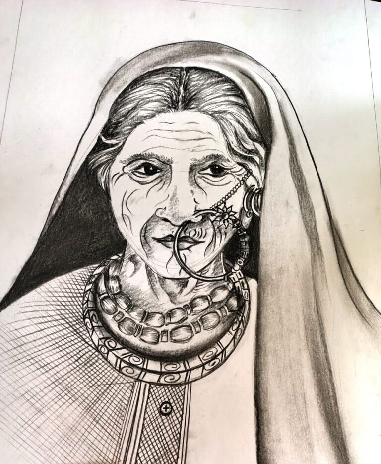 This striking black-and-white drawing depicts an elderly woman adorned in traditional attire, wearing a headscarf and layered necklaces. A padlock is secured to her mouth with a chain, symbolizing silence or restraint. The detailed sketch showcases the artist’s skill in capturing emotion and cultural essence. The artwork evokes thoughts on freedom of expression and the stories of women in tradition.