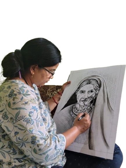 This art beautifully captures the essence of Indian cultural heritage. The woman’s traditional attire, adorned with intricate jewellery like a nose ring, earrings, and necklaces, reflects the rich customs of India. The red headscarf with white polka dots and the blue dress with polka dots add vibrant touches.